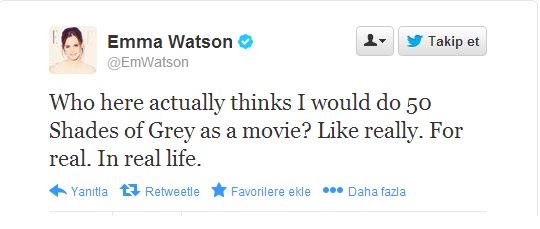 Harry Potter serisinde Hermonie karekterini canlandıran ve tüm dünyada azımsanamayacak bir hayran kitlesi bulunan Emma Watson’un geçen haftalar da erotik kitap serisi olan  Grinin 50 Tonu (Fifty Shades of Grey) ‘nun sinema versiyonunda oynayacağı haberleri yayılmıştı.