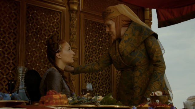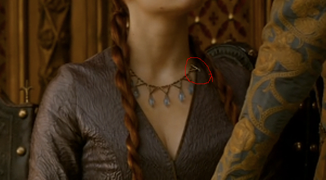 Sansa’nın saçıyla oynayan ve üstünü düzelten Olenna Tyrell’in eli kolyeye gidiyor ve yapmak istediğini yaptıktan sonra Sansa’nın yanından ayrılıyor.. Ve bu sırada bizler kolyede eksik bir parça olduğunu görüyoruz.